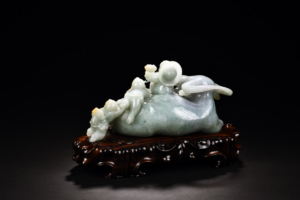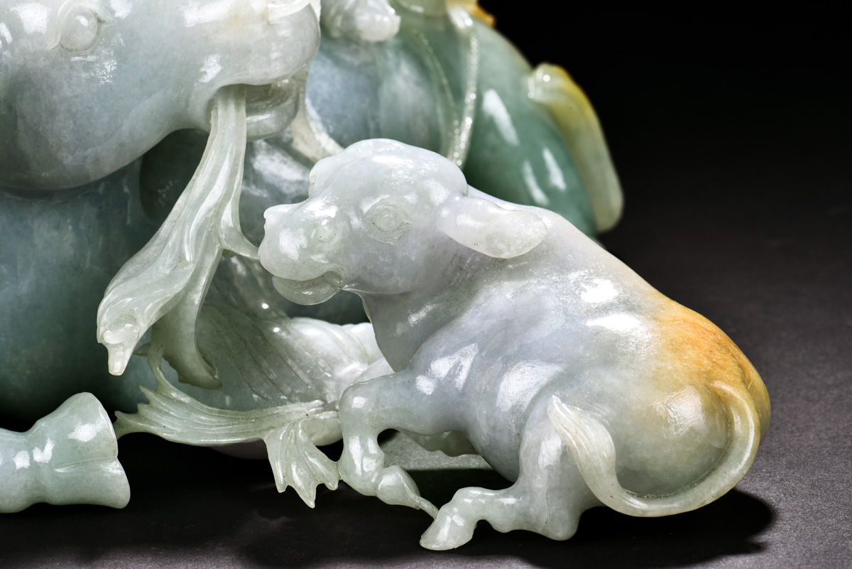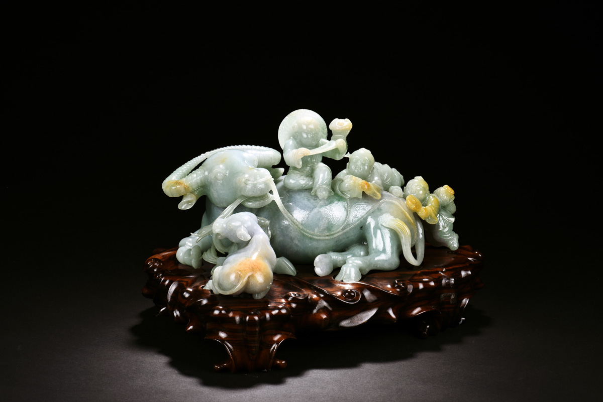 The jadeite suffused with green、 honey and lavender color, carved as ox with fairy childs holding Ruyi, book and toy, symbolizing luckniess and happiness, jadeite approximately 29.10x23.30x14.60 cm, weight approximately 5.5 kilograms.