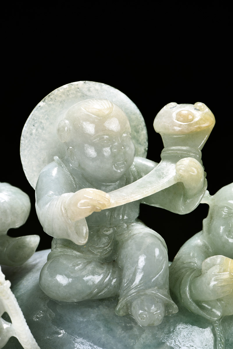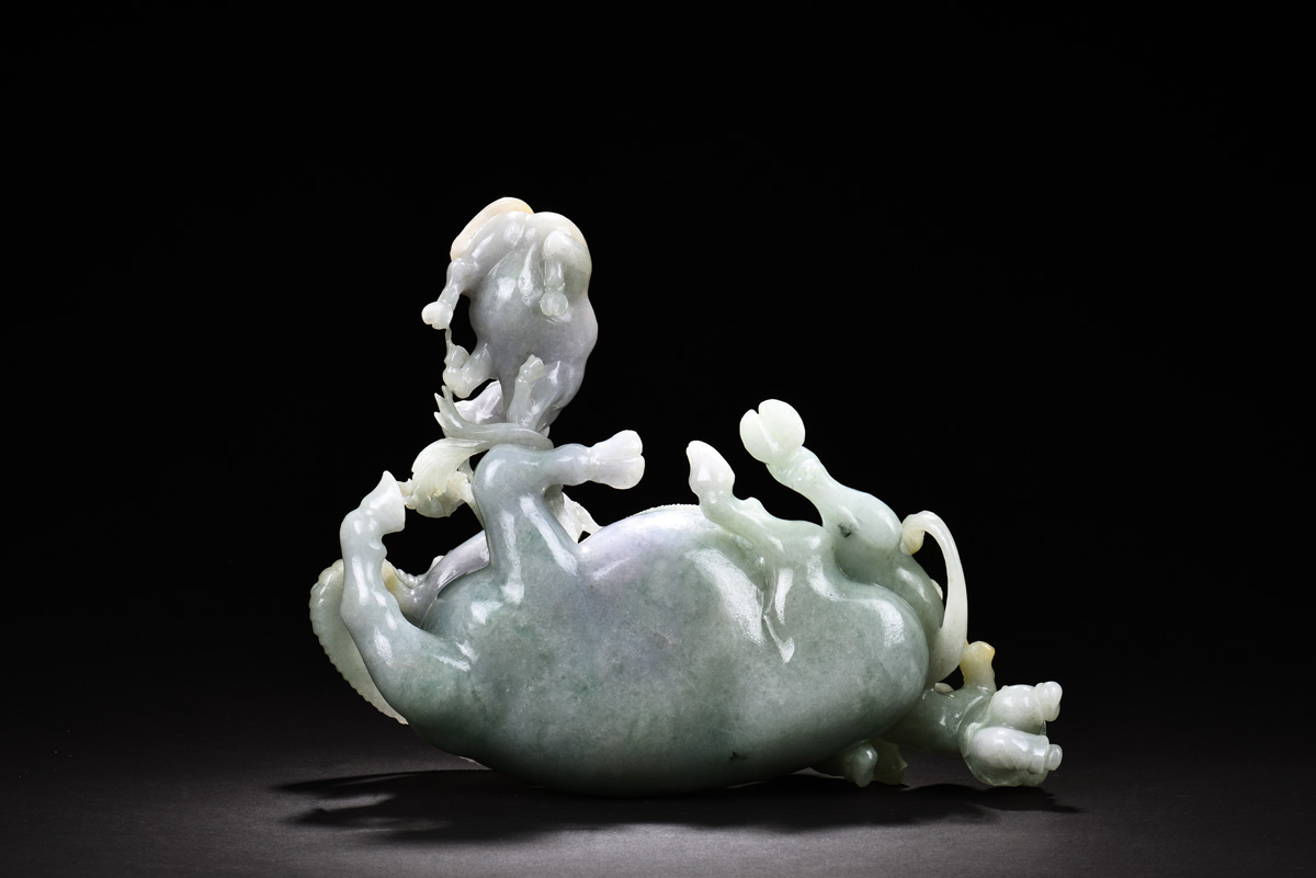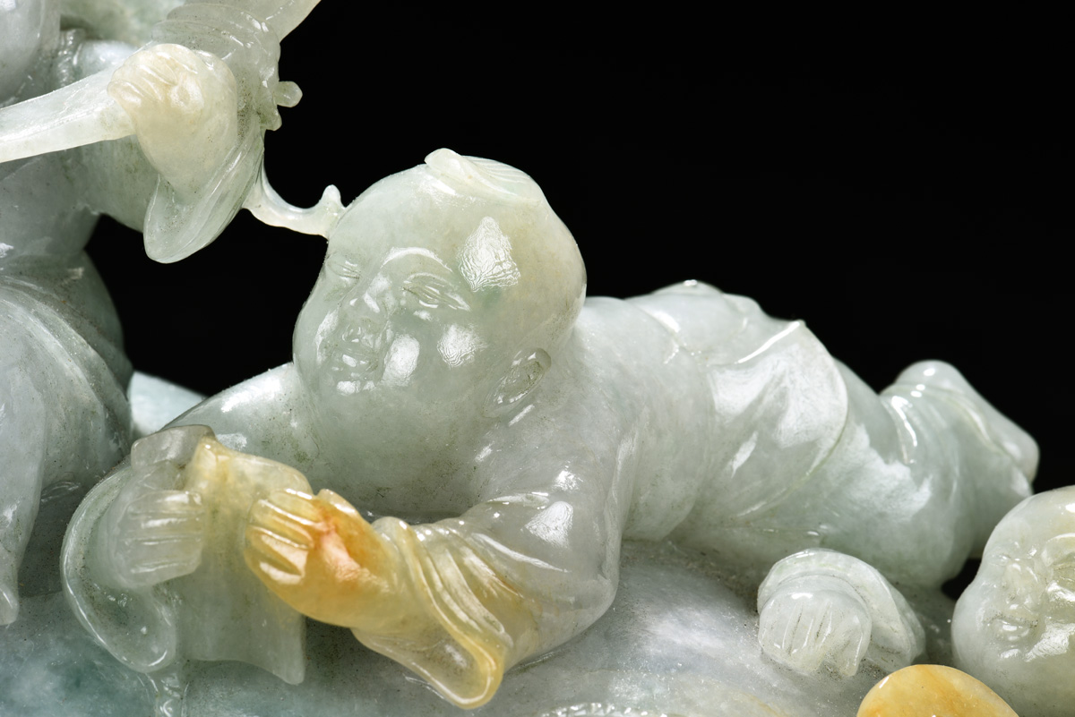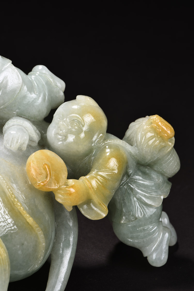 The jadeite suffused with green、 honey and lavender color, carved as ox with fairy childs holding Ruyi, book and toy, symbolizing luckniess and happiness, jadeite approximately 29.10x23.30x14.60 cm, weight approximately 5.5 kilograms.