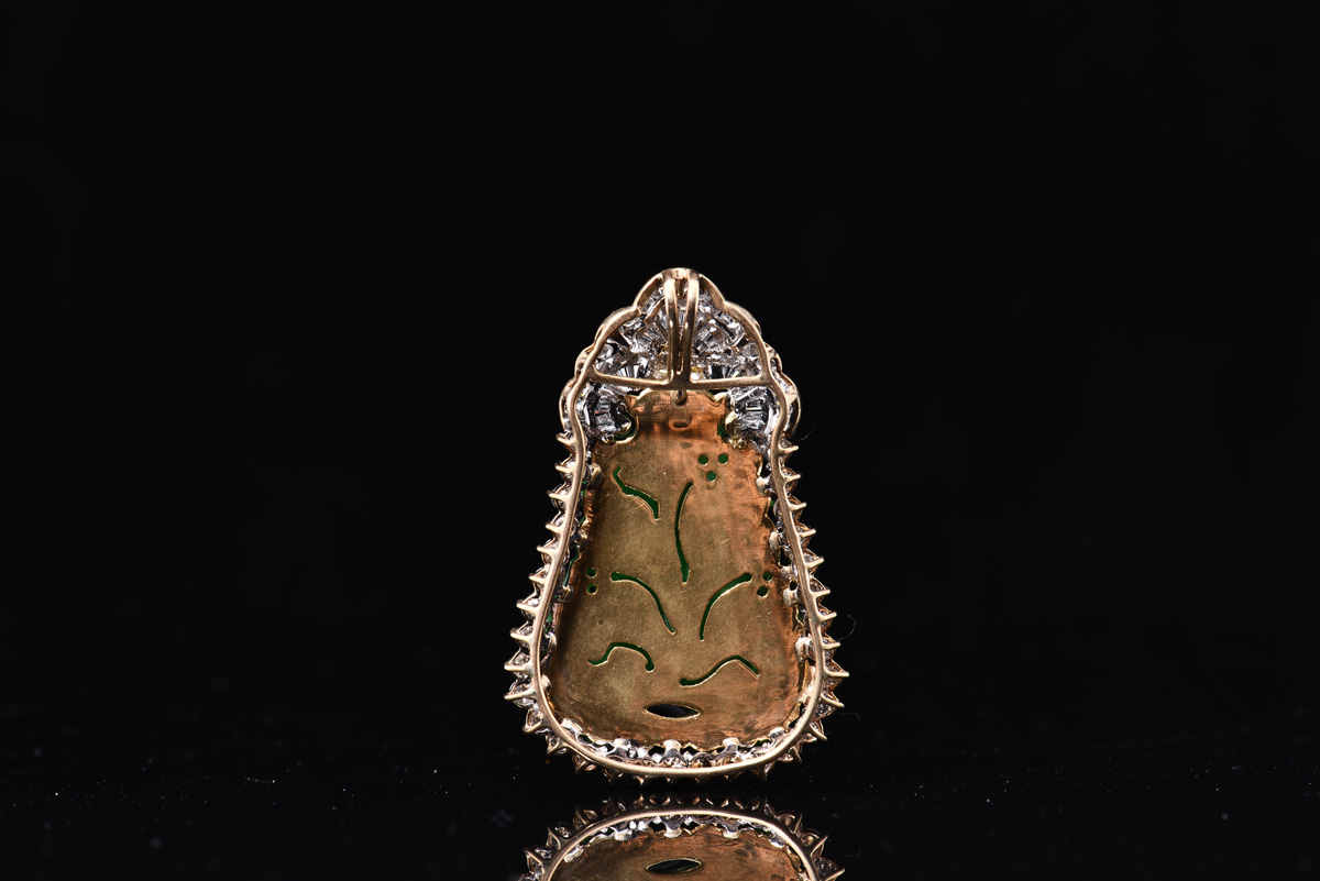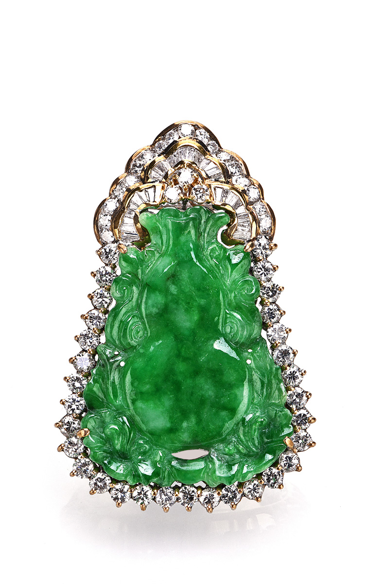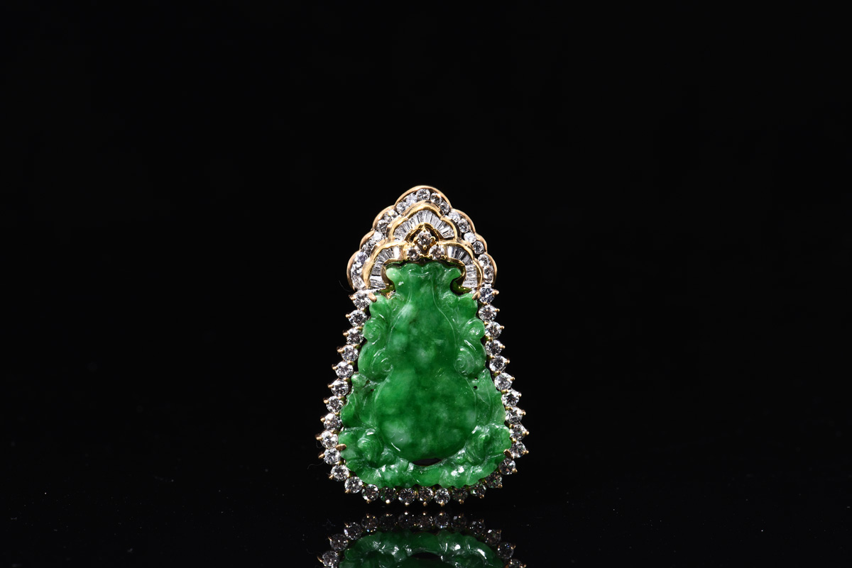 The Jadeite carved as calabash, symbolizing happiness and prosperity, surmounted by round brilliant-cut and tapered baguette diamonds, jadeite approximately 29.80 x 22.80 mm.