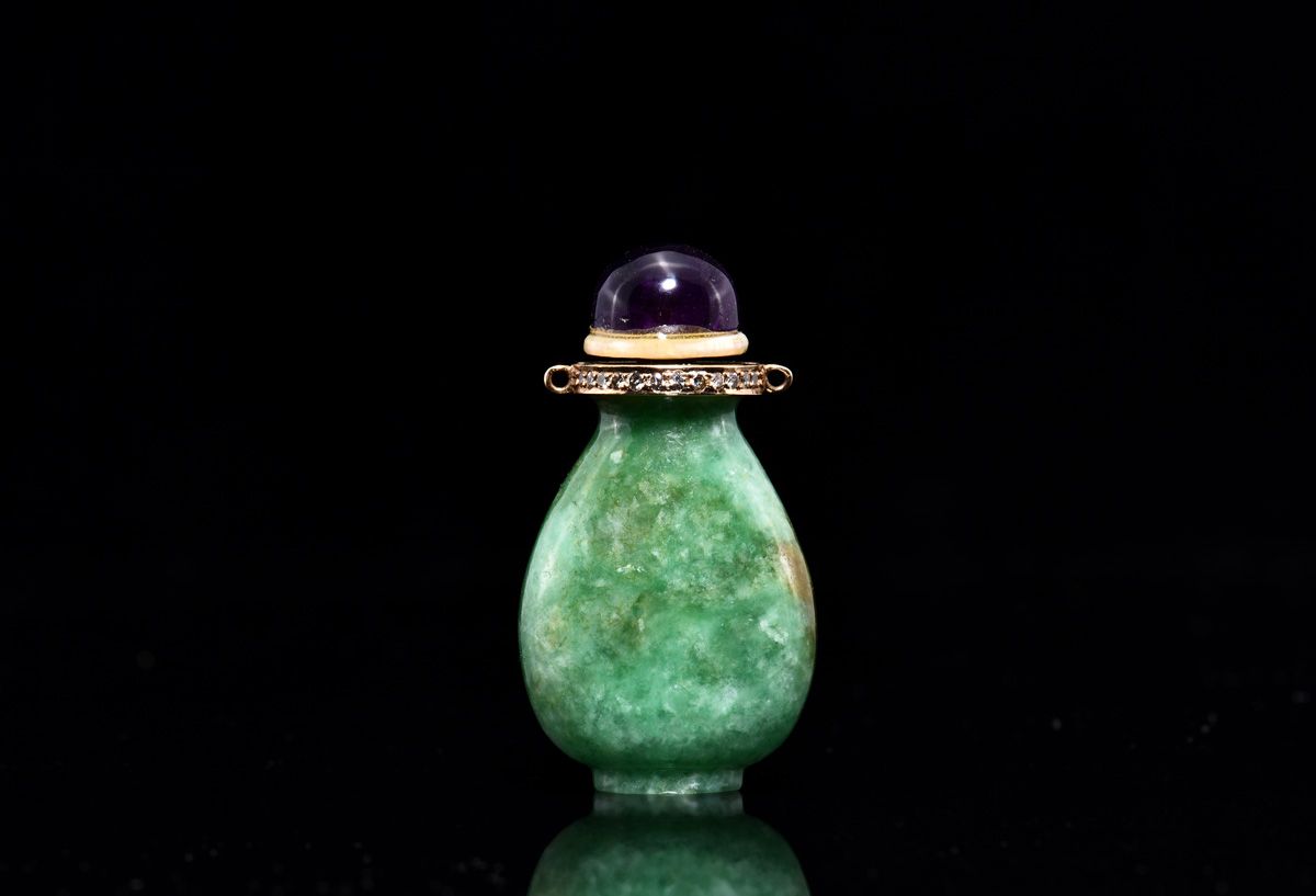 The jadeite carved as snuff bottle, surmounted by round brilliant-cut diamonds, completed by amtheyst stopper, can be used as ornament or pendant, total approximately 45.40 x 24.80x 15.50 mm, weight 23.14g.