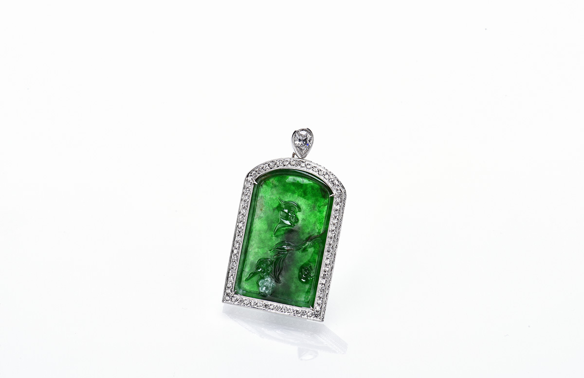 The jadeite carved with plum flower and bats, symbolizing elegance and happiness, surrounded by round brilliant-cut diamonds and surmounted by one nearly colorless pear shape diamond, jadeite approximately 33.65 x 21.00 x 2.90 mm