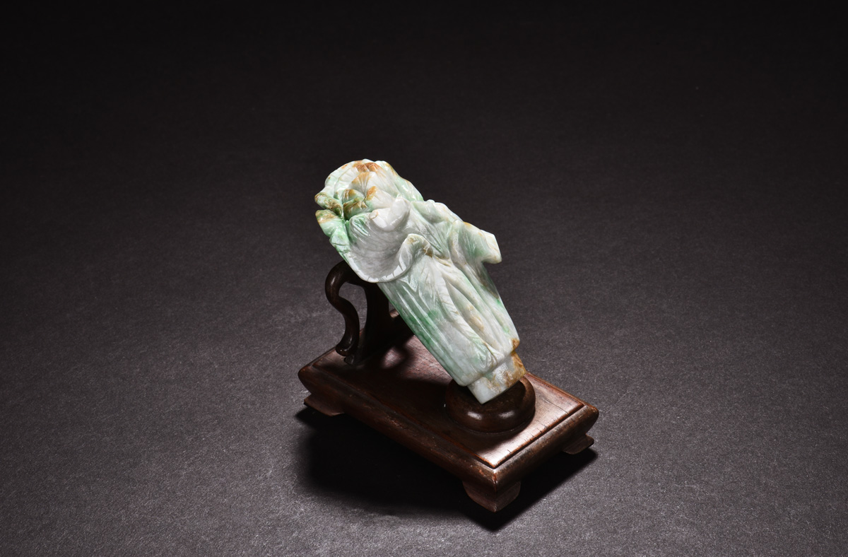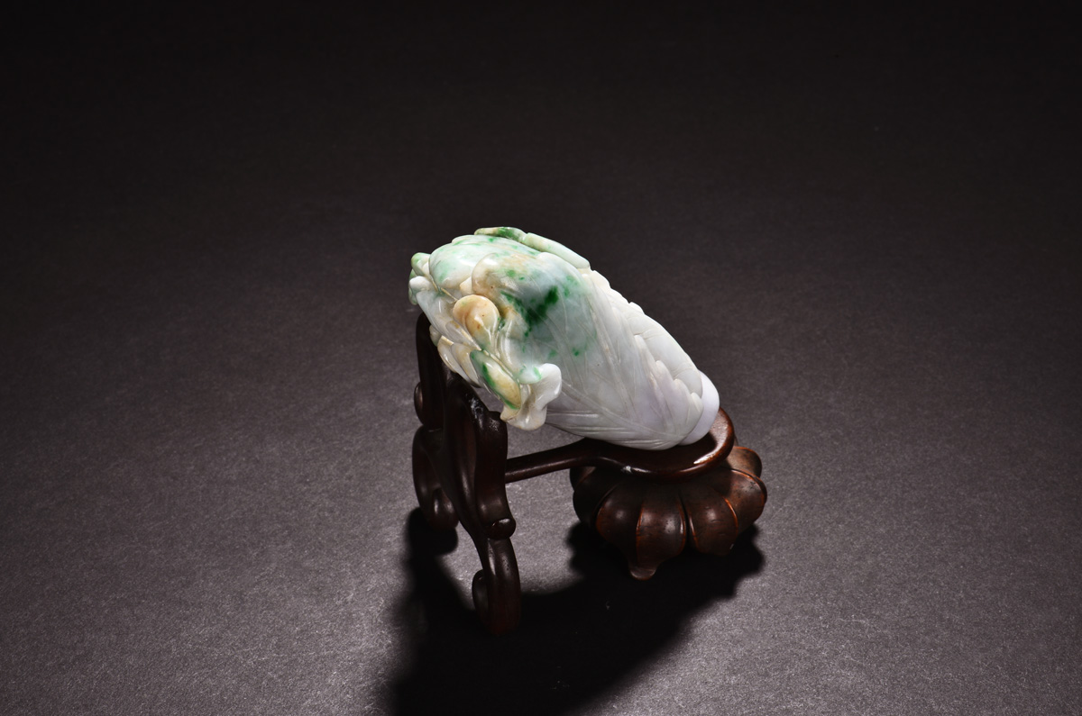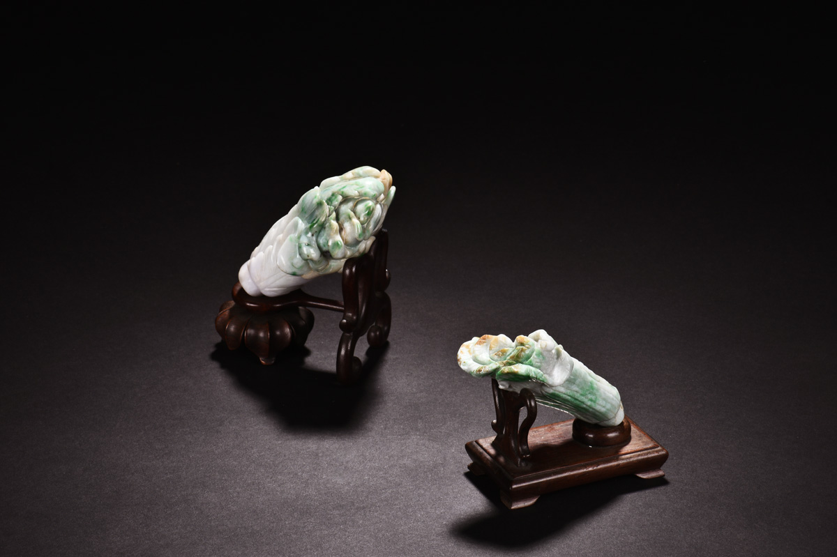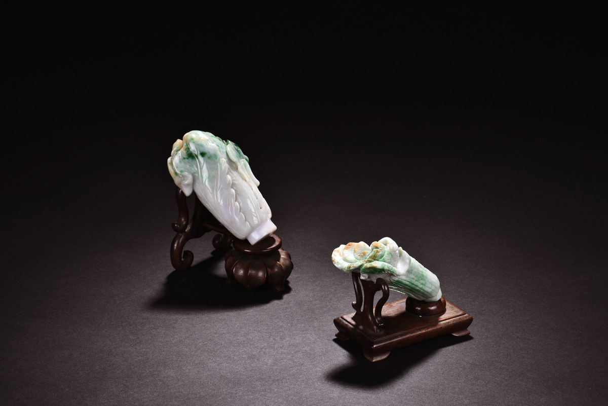Each pair of jadeite carved as Chinese cabbage, symbolizing and bringing luch and wealth, approximately 85x60x45mm and 80x40x30mm respectively.