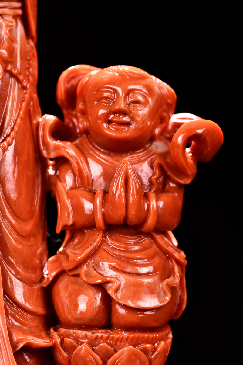 天然橘紅珊瑚雕童子拜觀音 寓意和氣生財