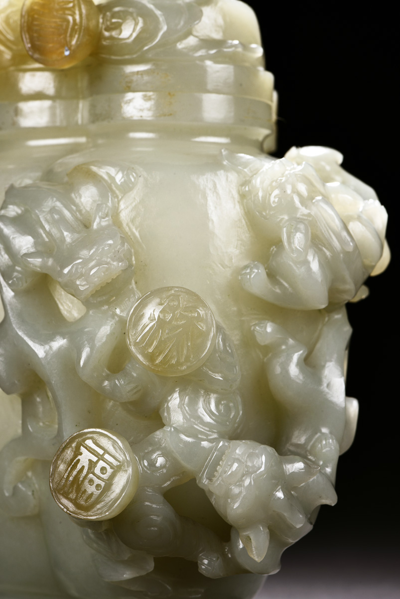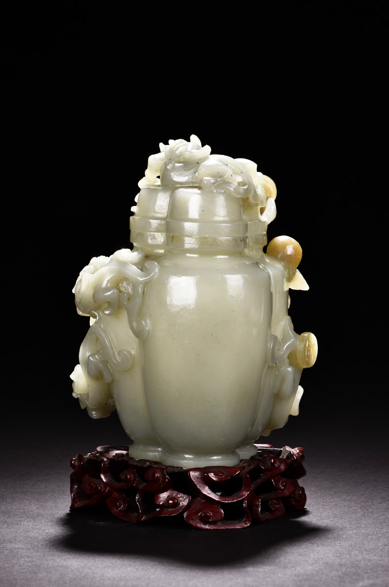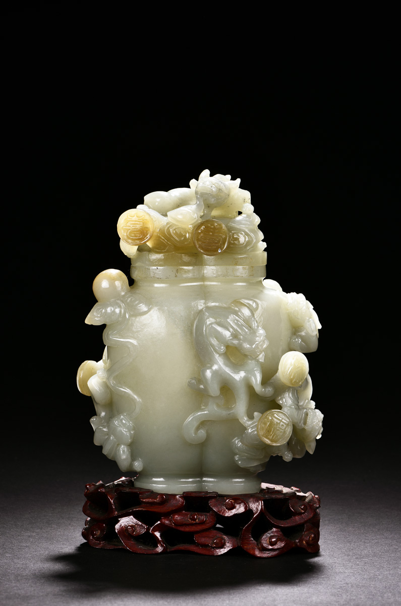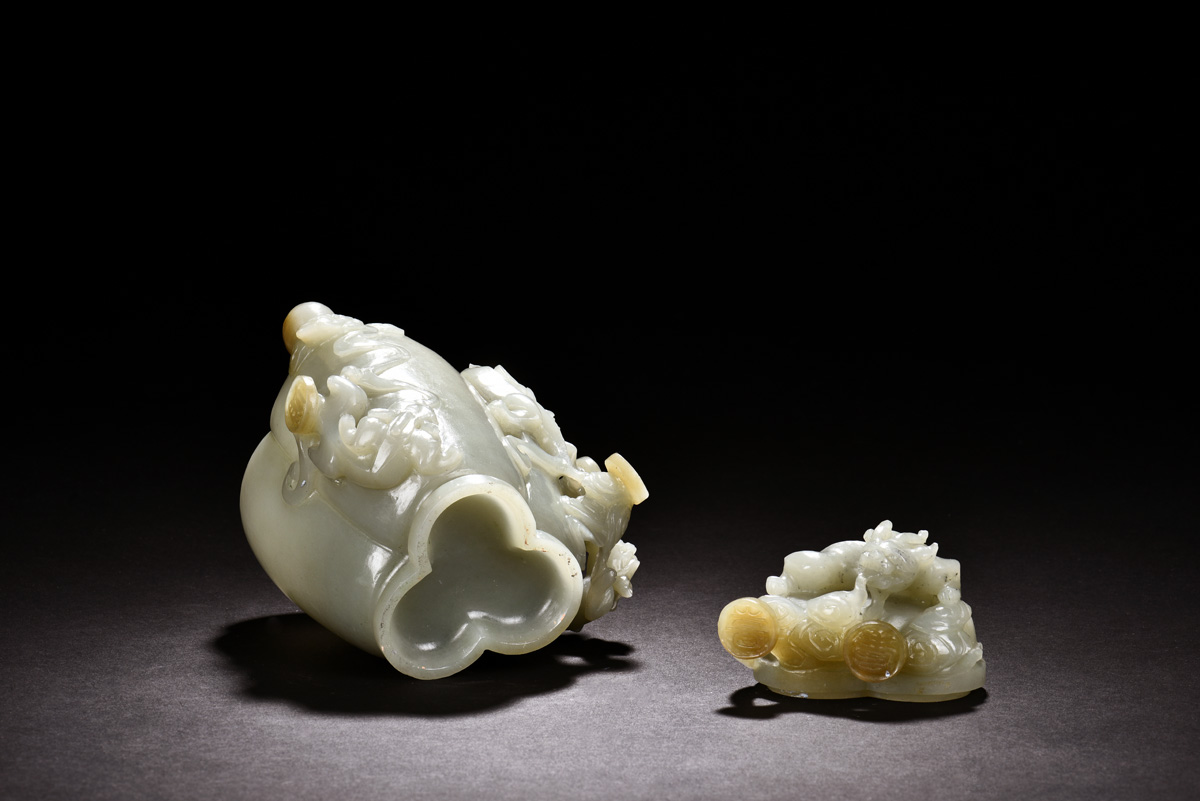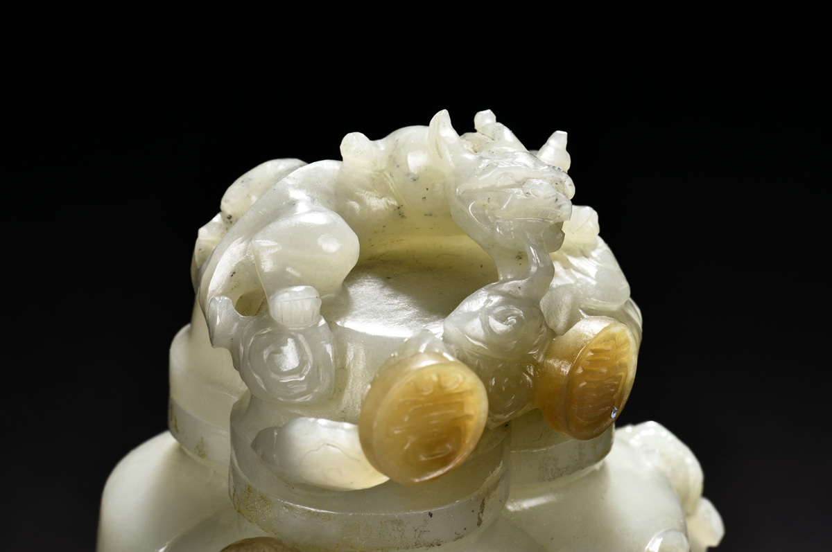 The white jade kettle carved as Kylin carrying luckiness and longevity, jade approximately 7x12x17 cm, weight approximately 888g.