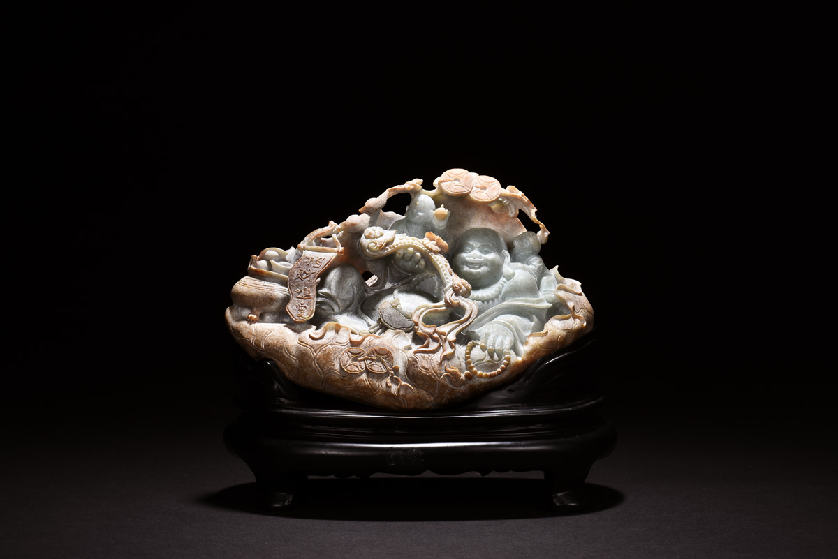 The jadeite carved as Milefo holding Ruyi and suffused with ingot, symbolizing and bringing fortune and happiness, jadeite approximately 26.30 x 16.70 x 13.20 cm, weight approximately 5.31 kg.