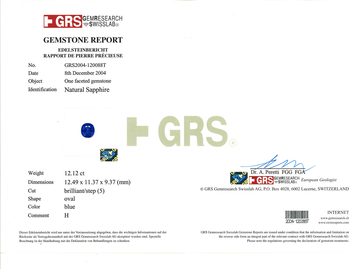 Accompanied by GRS report numbered GRS2004-120088T, stating that the sapphire is natural with heating treatment.