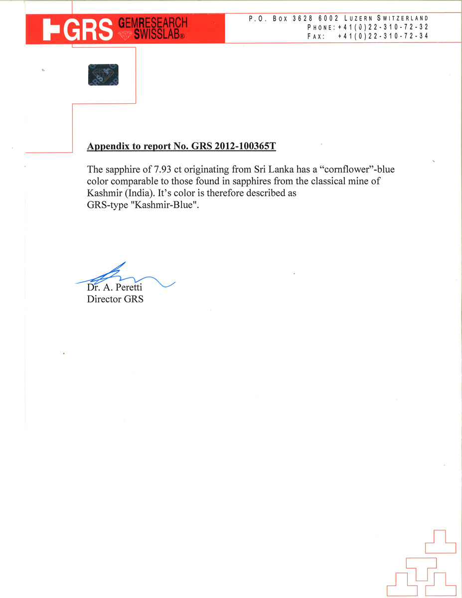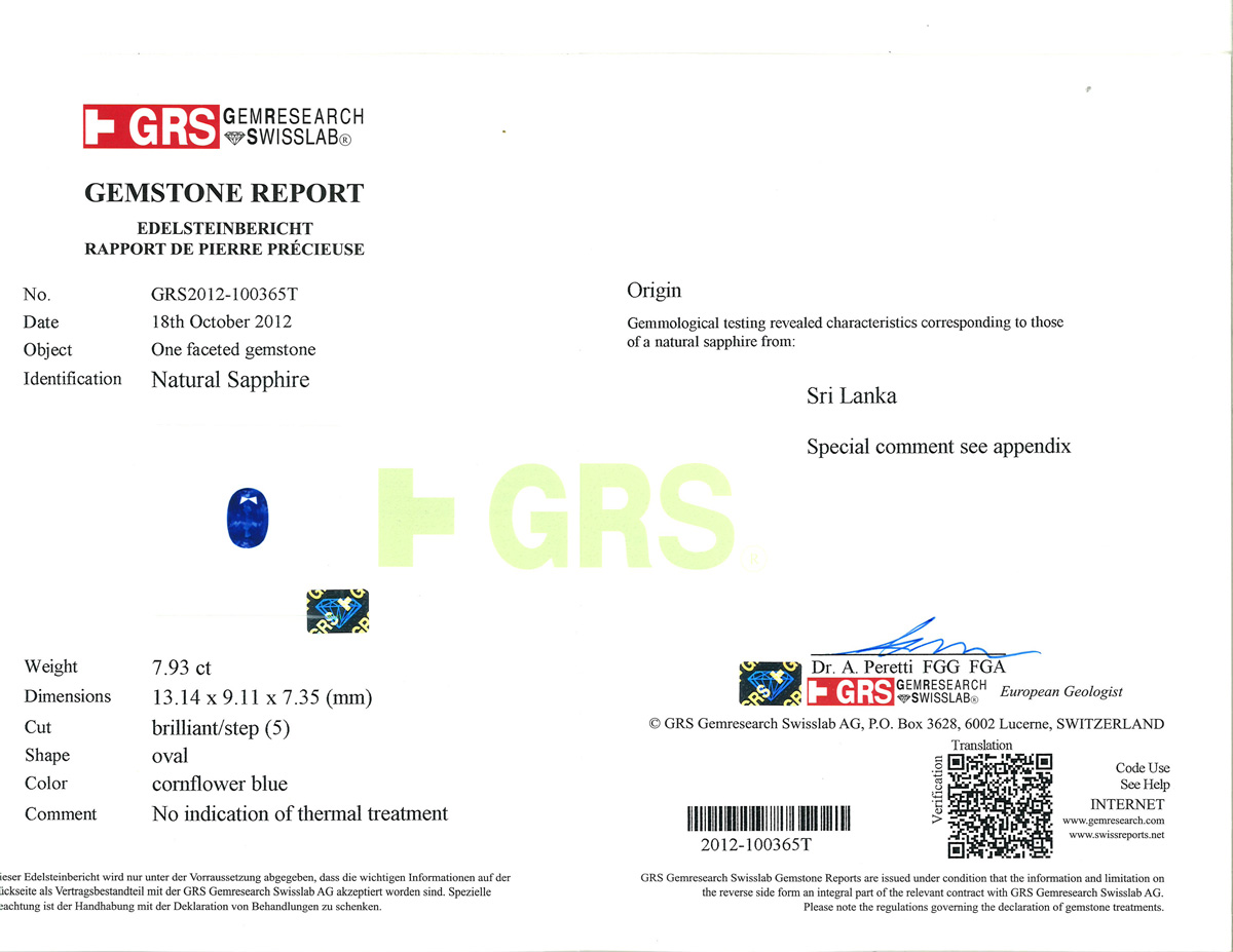Accompanied by GRS report numbered GRS 2012-100365T, stating that the sapphire is natural, no indication of treatment.