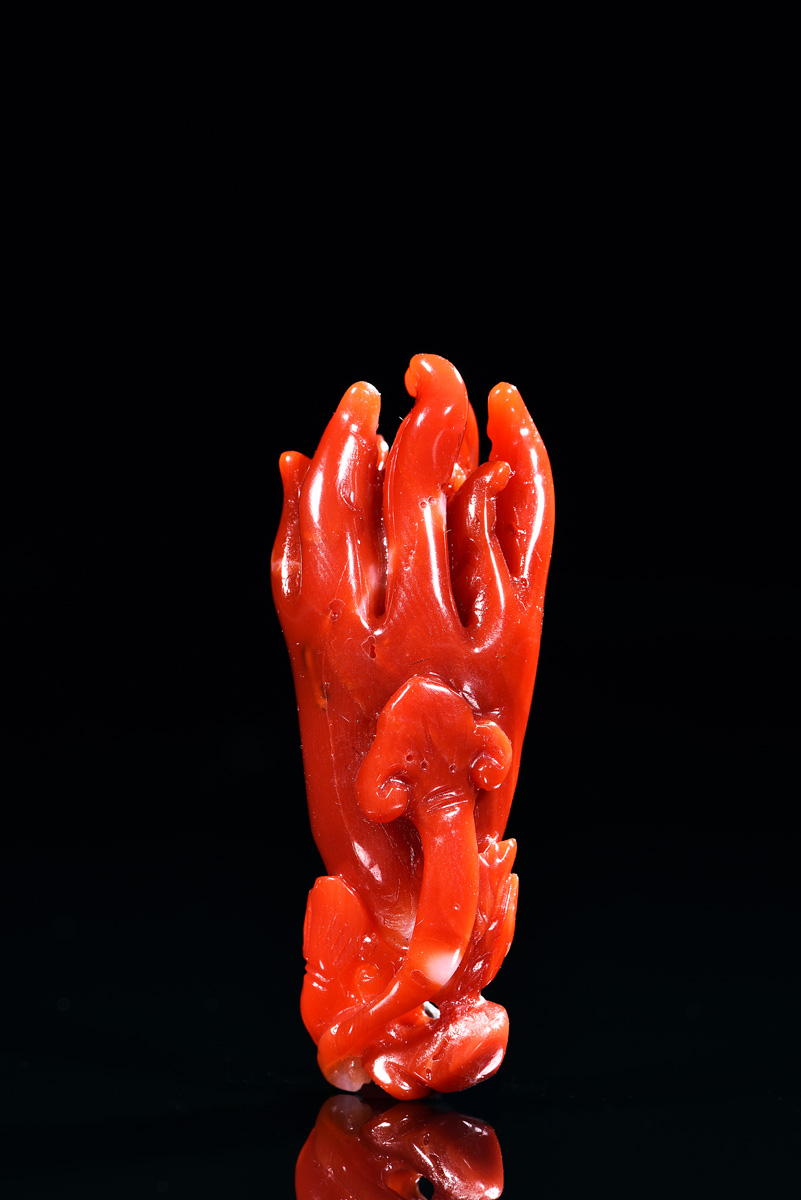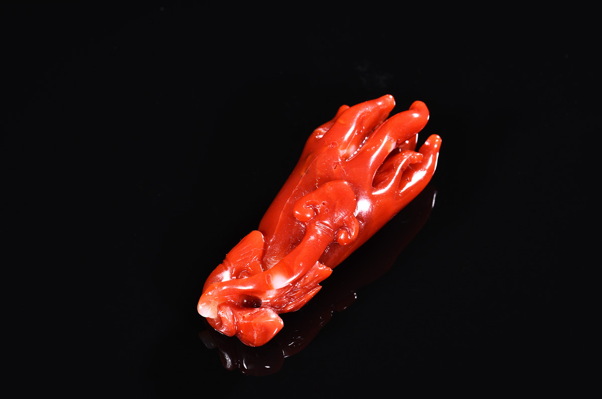 The coral carved as Buddha's Hands with Ganoderma lucidum, symbolizing happiness and luckiness. Coral approximately 45.94 x 17.74x 10.95 mm