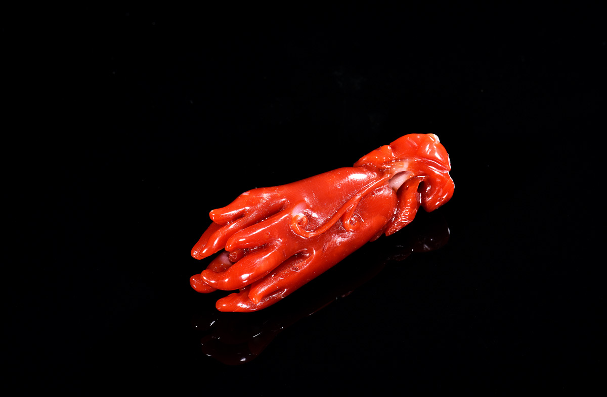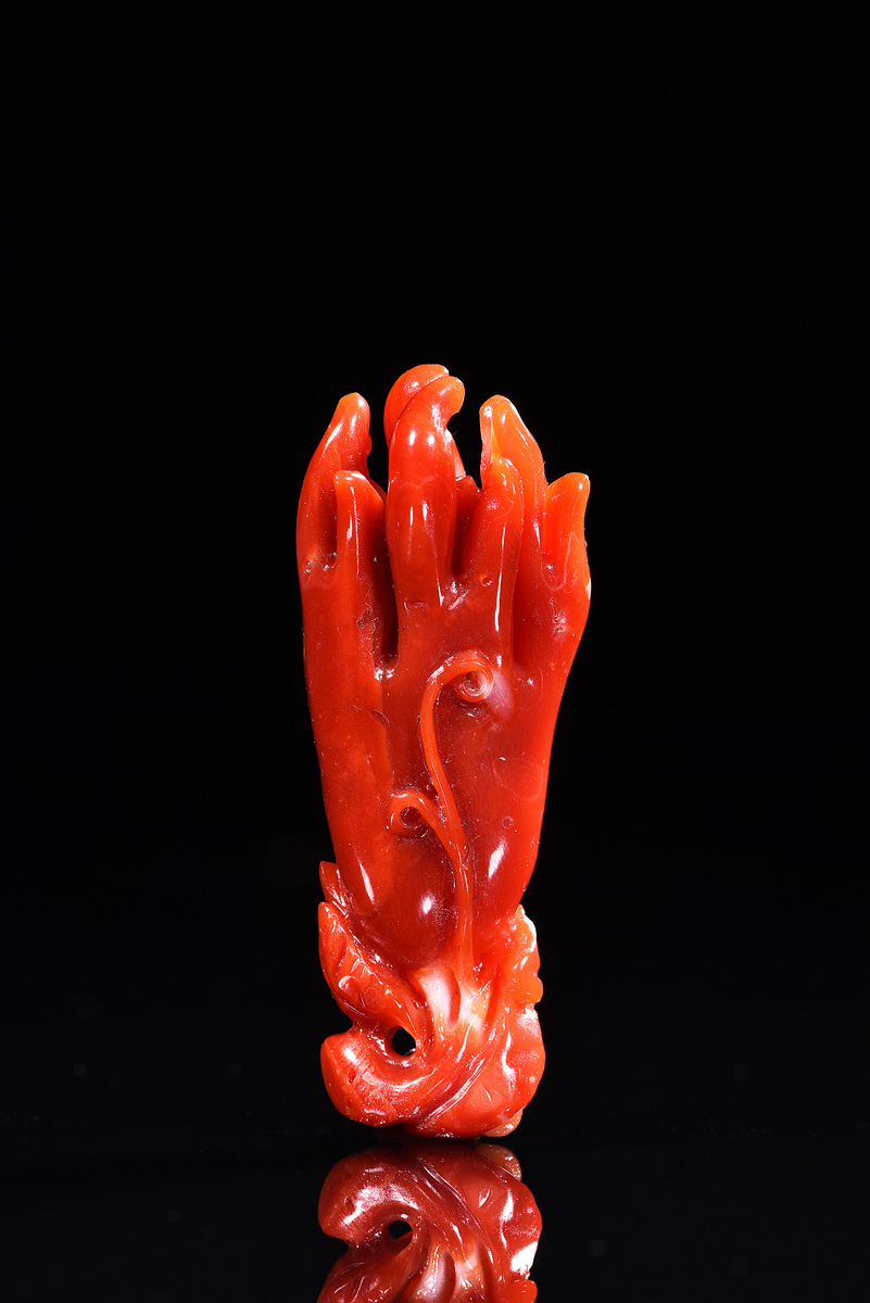RED CORAL BUDDHA HANDS WITH GANODERMA LUCIDUM ORNAMENT