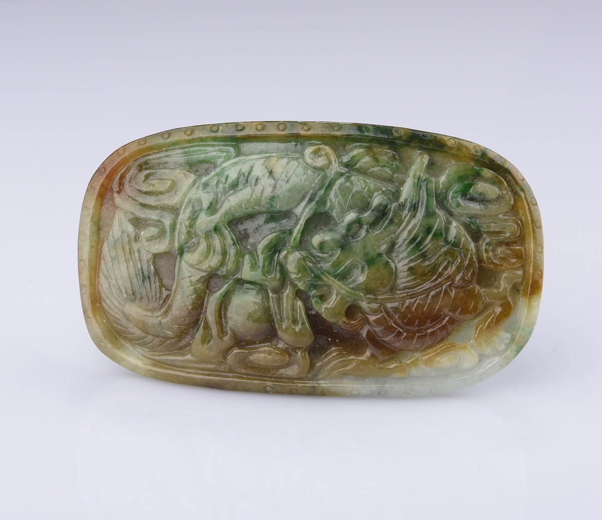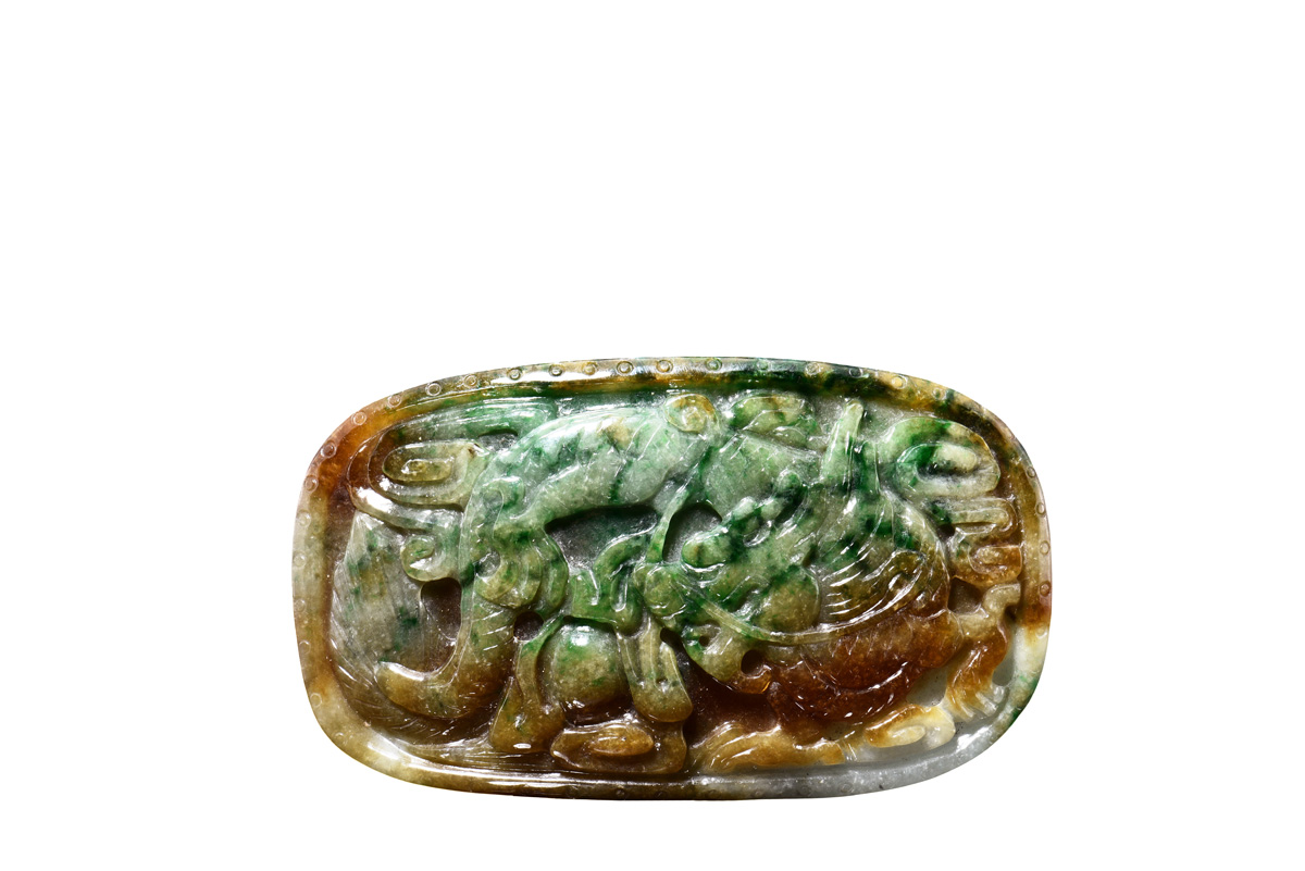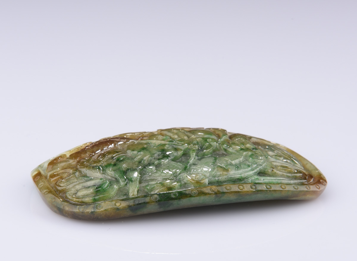 TRI-COLOR JADEITE ORNAMENT WITH GIA CERTIFICATE