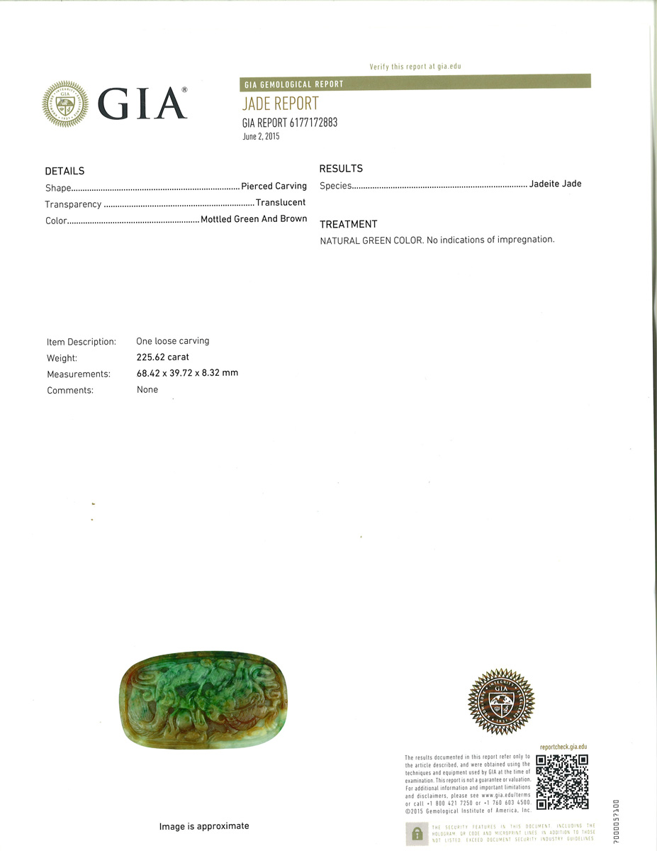 Accompanied by GIA report numbered 6177172883, dated 2 June 2015, stating that the jadeite is natural, known in the trade as "A jade"