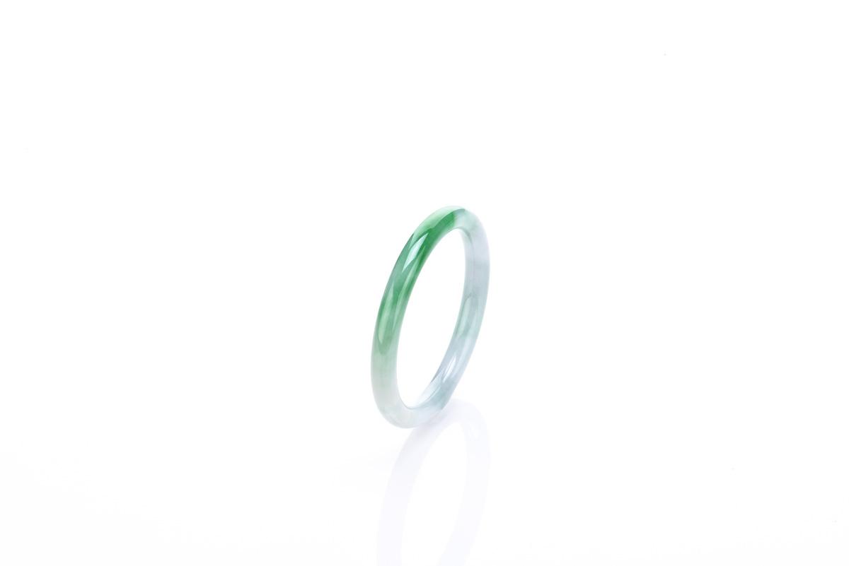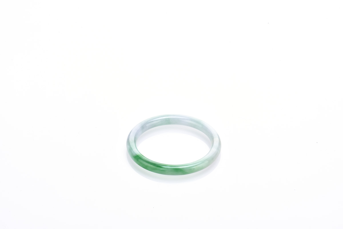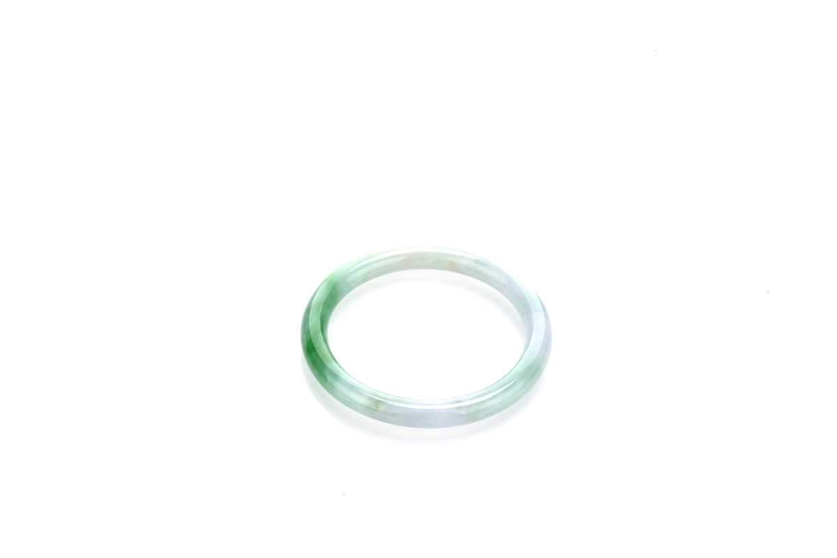 The circular jadeite bangle of moss in snow tone with splashes of emerald green color. Inner diameter and thickness approximately 52.83 x 7.73 mm respectively.