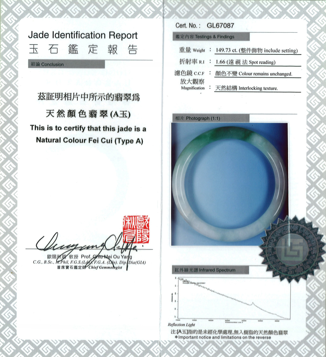 Accompanied by Hong Kong Gems Laboratory report numbered GL67087, stating that the jadeite is natural, known as" A jade".