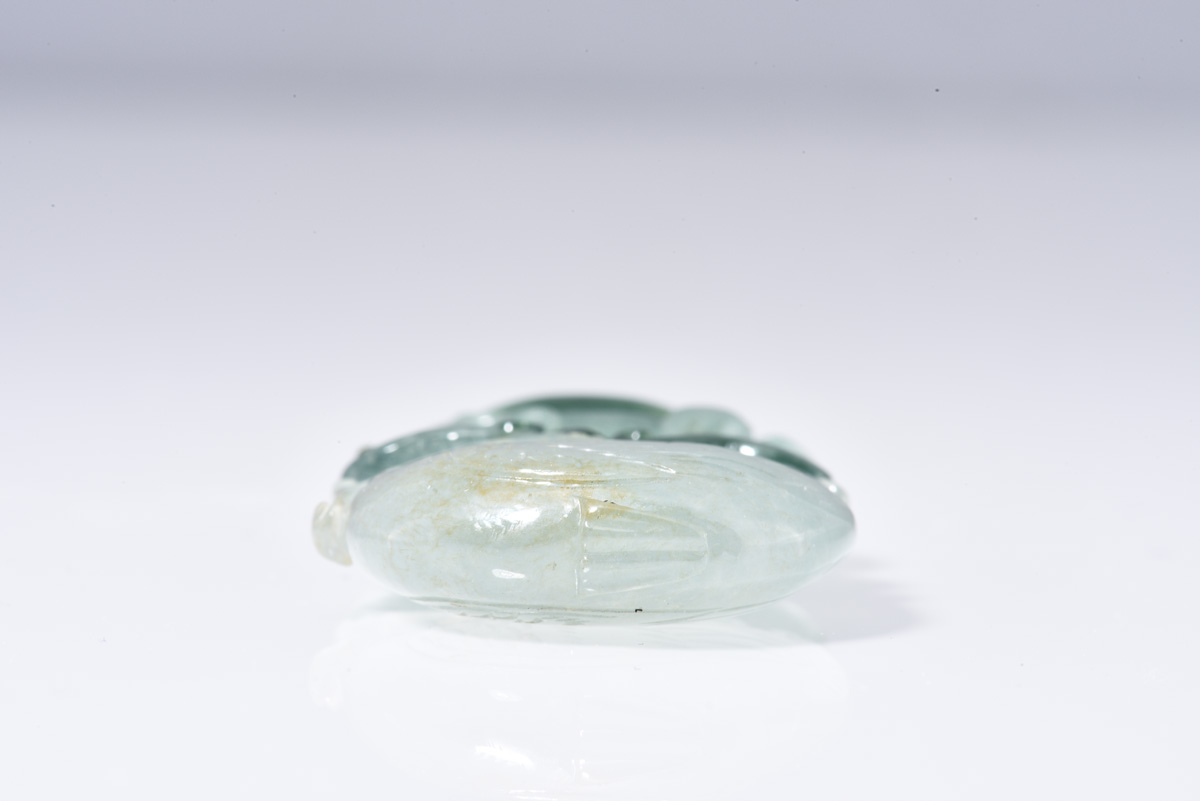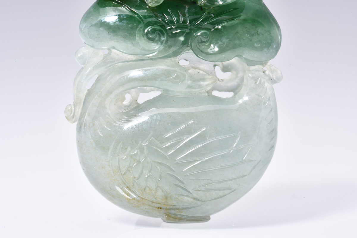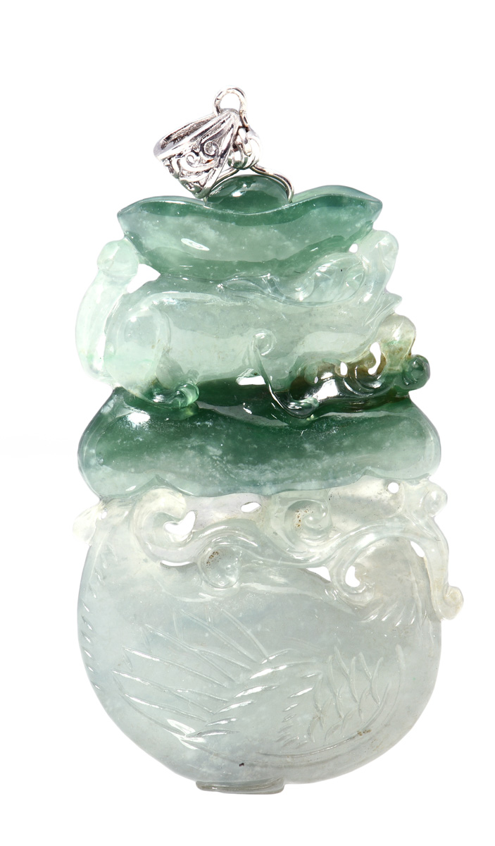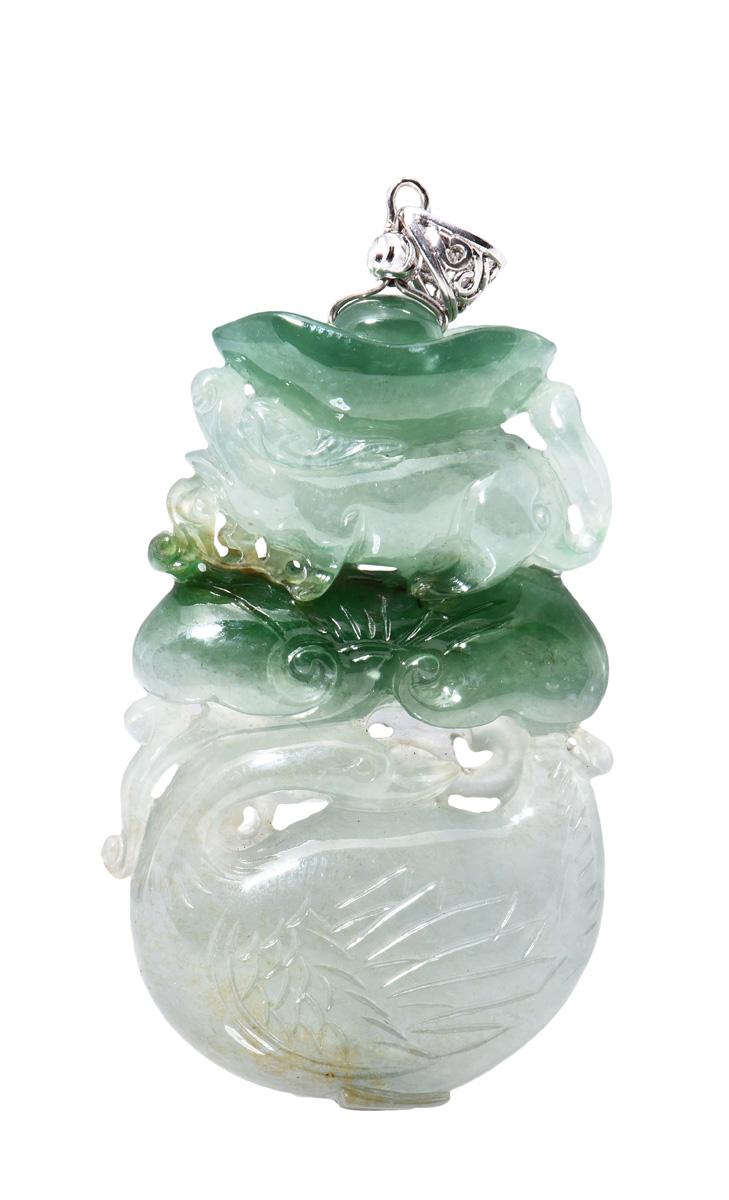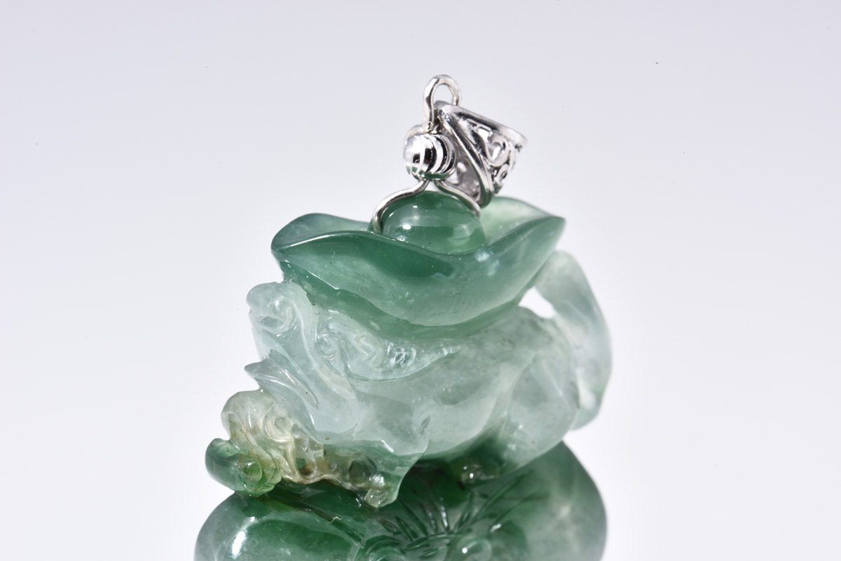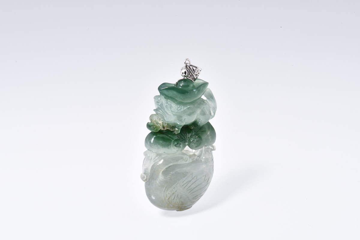 The jadeite carved with ingot 、pig and swan, symbolizing fortune and nobility, jadeite measuring approximately 44.67x 27.84x 9.04 mm