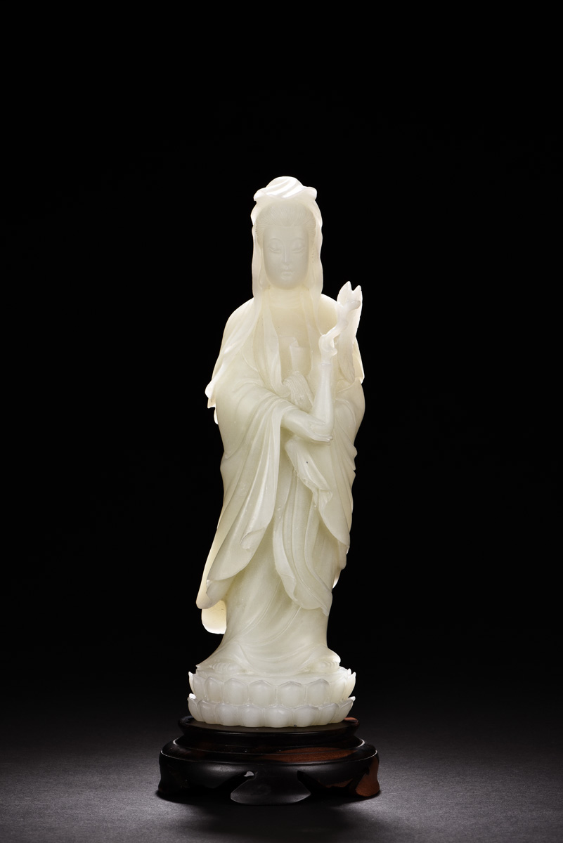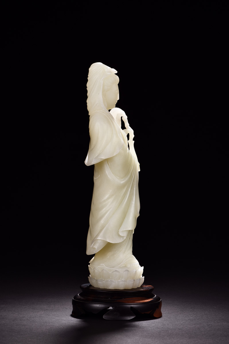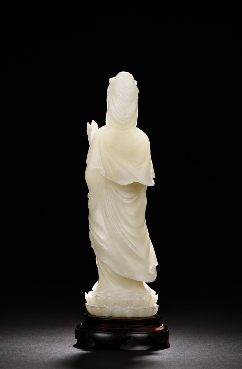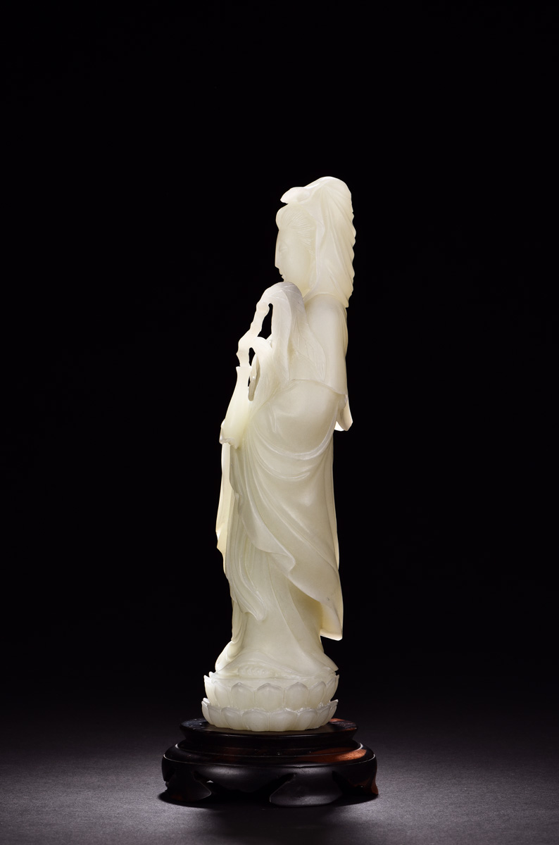 The white jade carved as Guanyin standing on a lotus throne, holding willow and static bottle, symbolizing and giving peace, white jade measuring approximately 28cm x 8cm x 7cm, weight approximately 1.72kg.