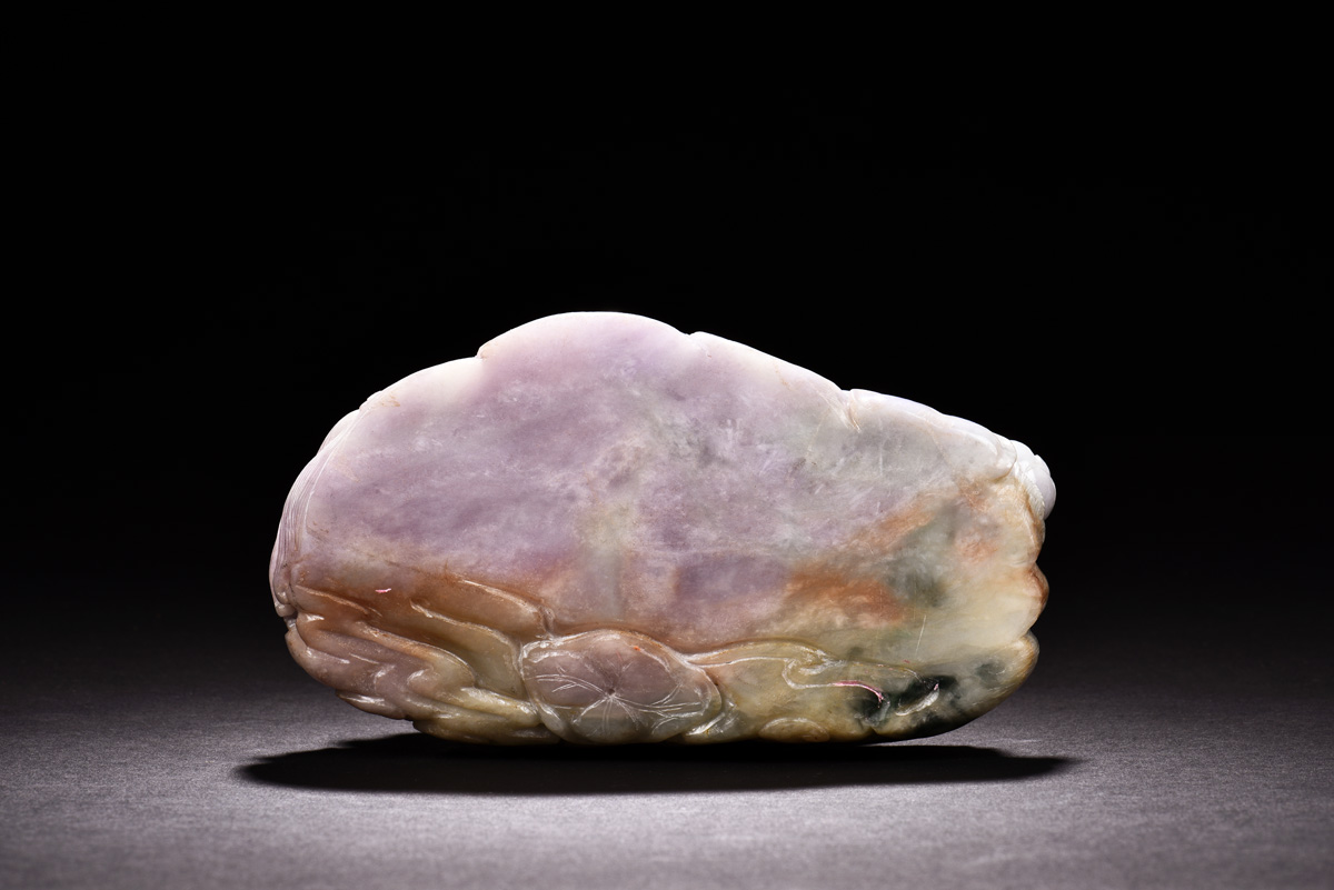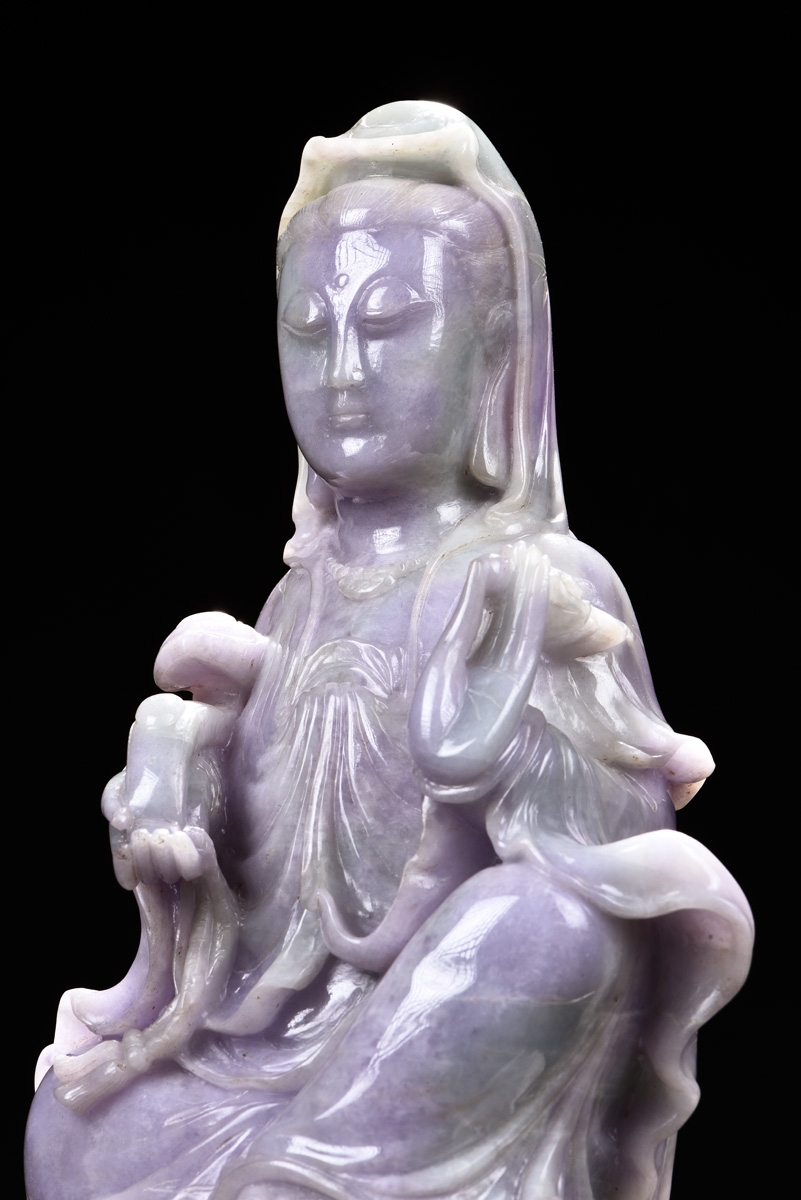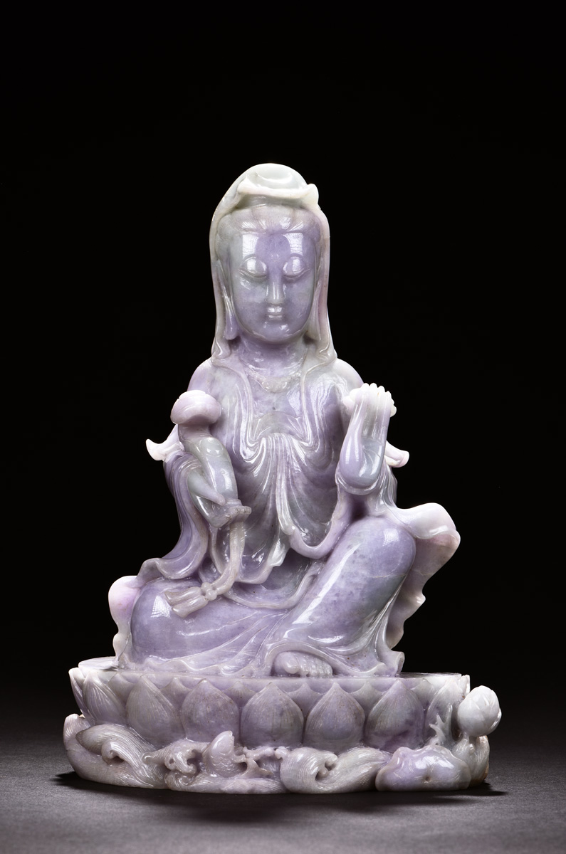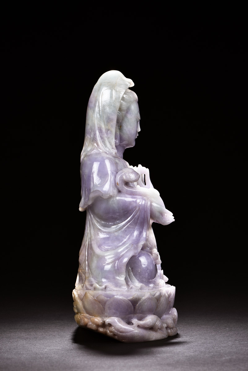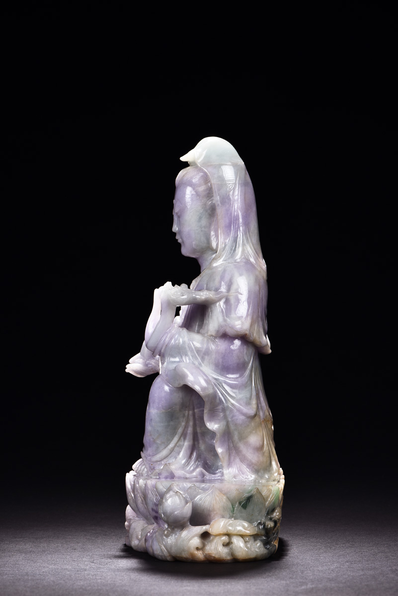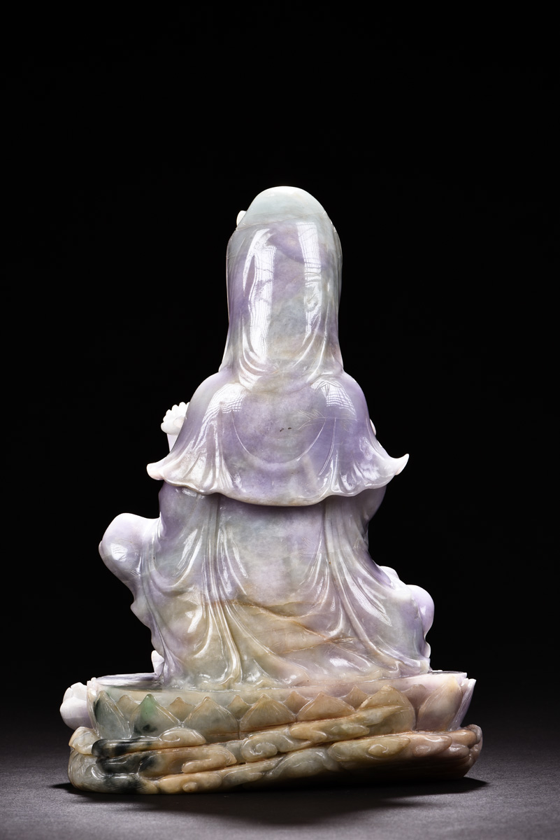 The jadeite carved as Guanyin suffused with lavender color sitting on a lotus throne, holding ganoderma lucidum, symbolizing and giving peace, jadeite measuring approximately 26cm x 11cm x 23cm, weight approximately 3.45kg.