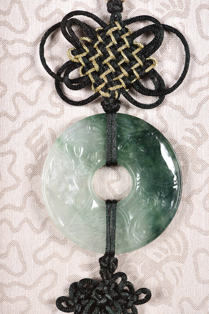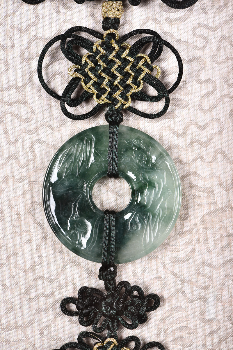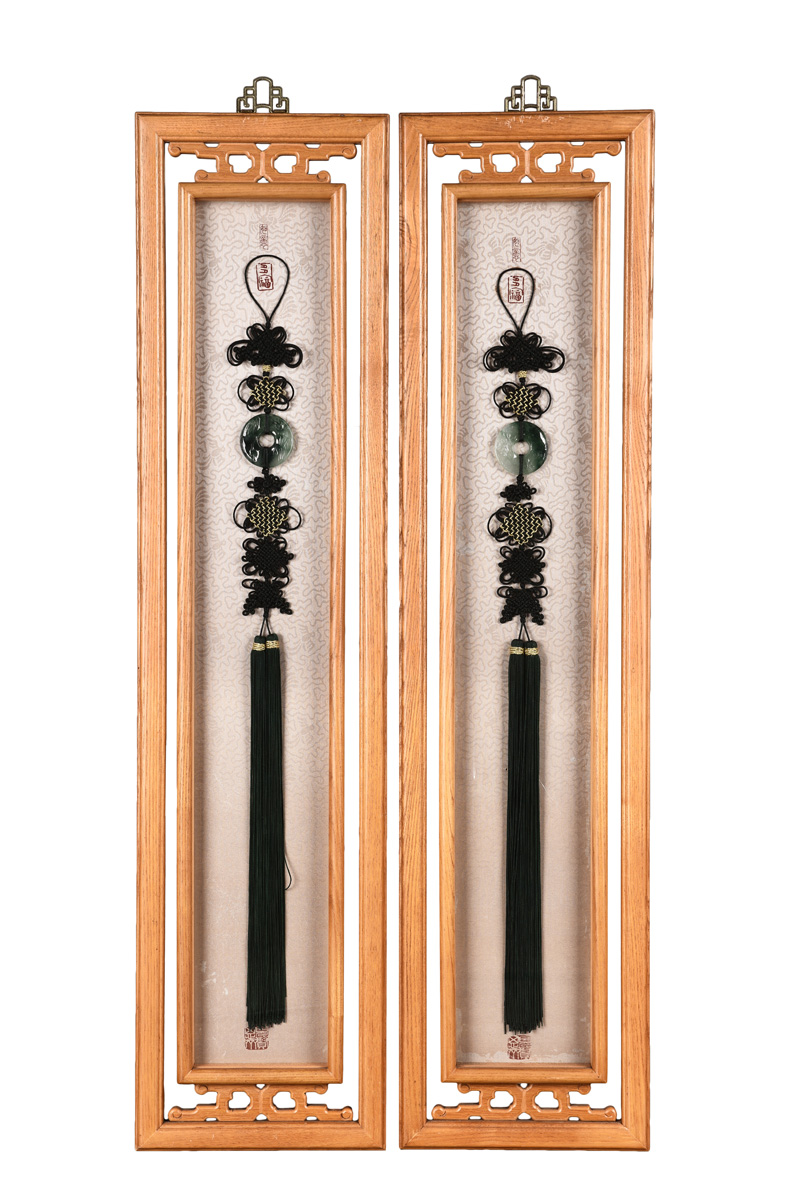 The pair of jadeite carved as ancient coin shape, decorated by Chinese knots, can be hang on the wall. Each jadeite measured approximately 52x55mm and each whole set approximately 103x24x1.8cm