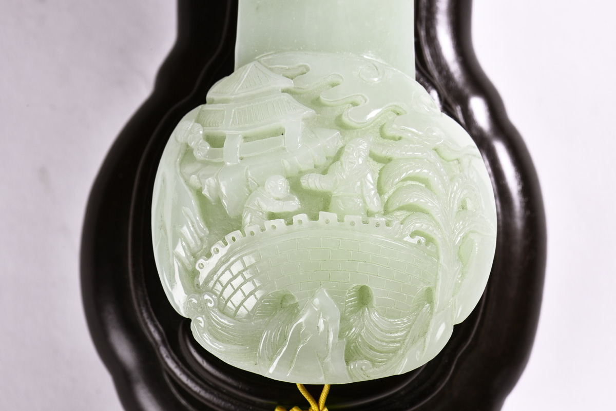 The nephrite jade carved as story of longevity couple, symbolizing longevity and happiness, jade approximately 36.60 x 13.60x 5.50cm, weight approximately 1.5kg