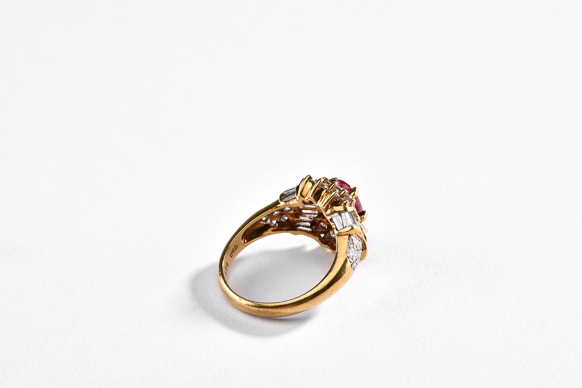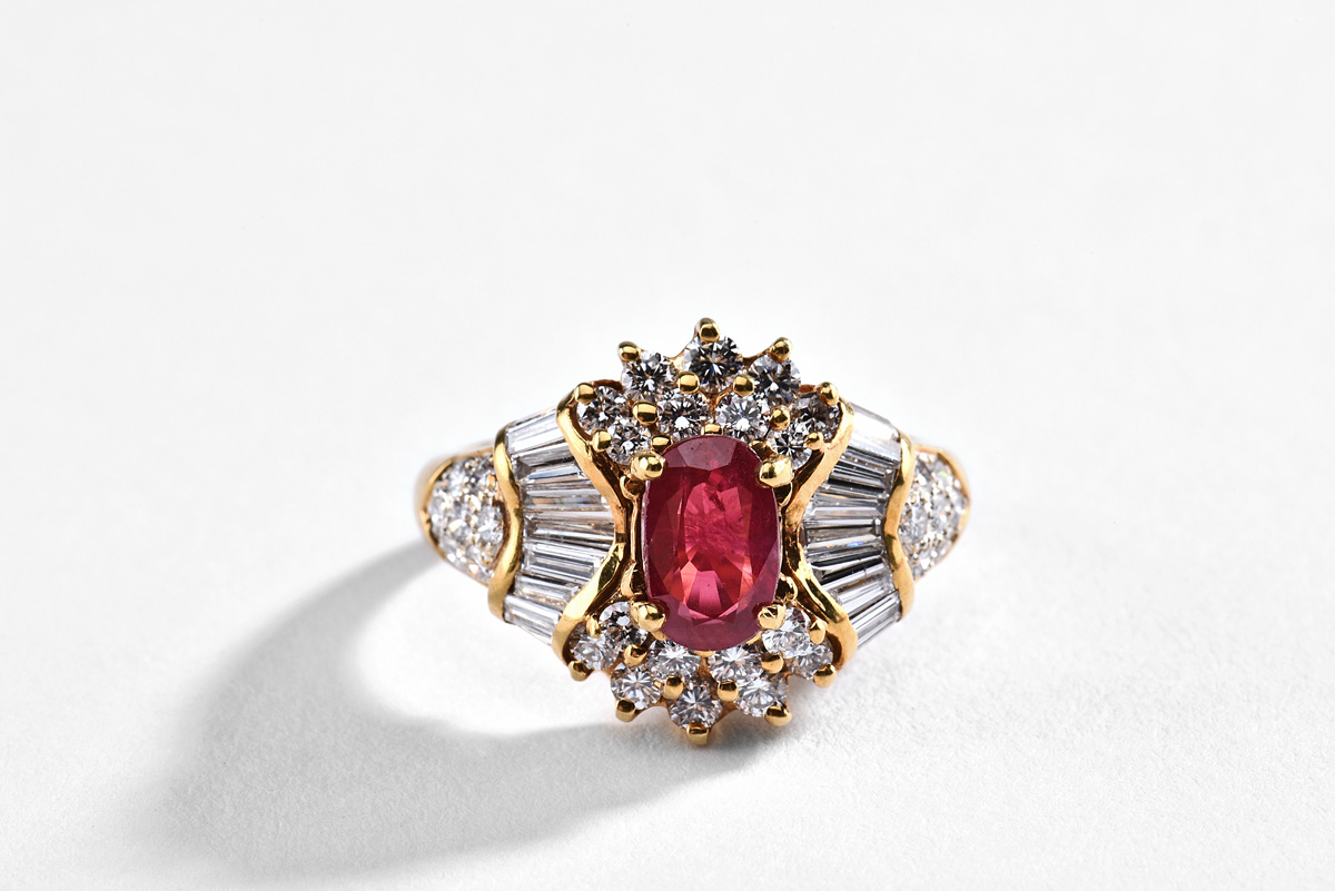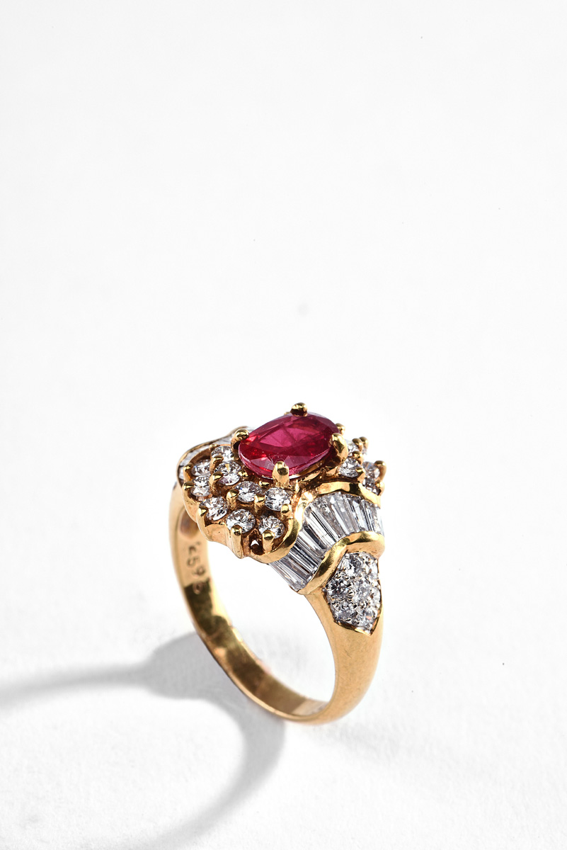 Centering on an oval shaped ruby weighting approximately 1.21 carats, surrounded by round brilliant-cut and tapered baguette diamonds, ring size around 6.5