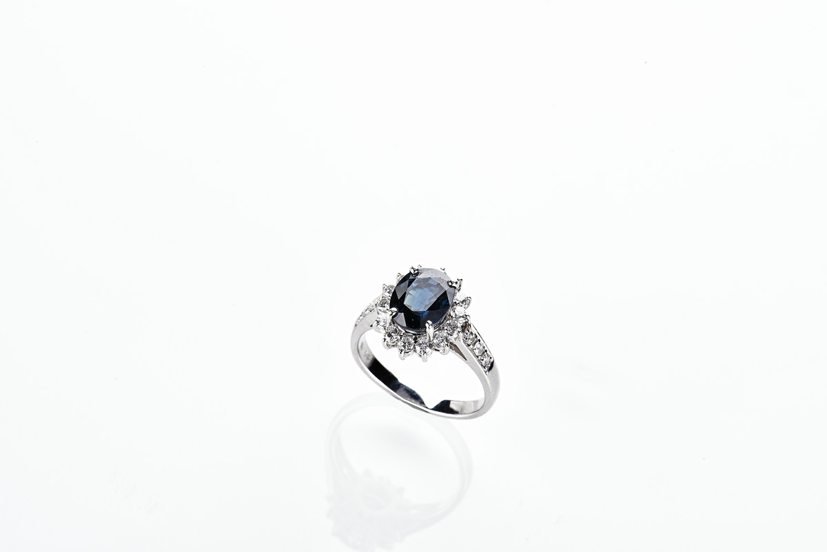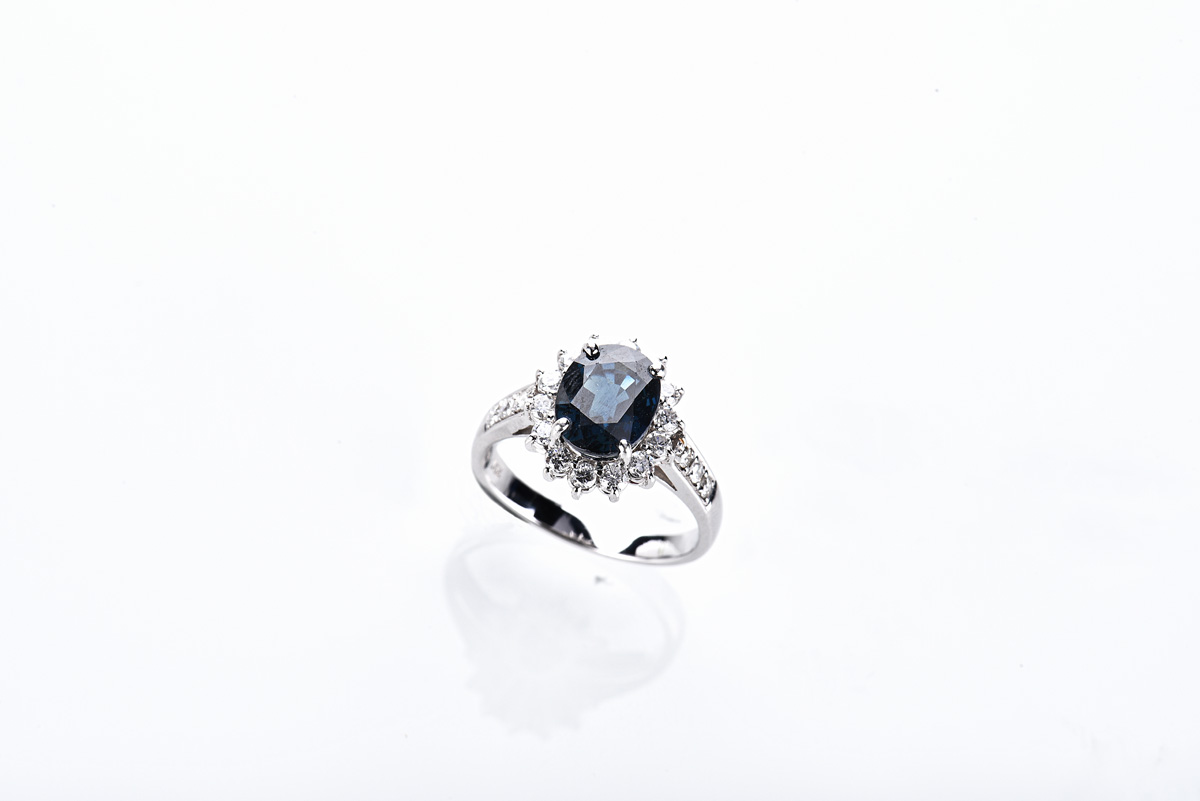 Centering on a oval shaped blue sapphire weighting approximately 3.13 carats, surrounded by round brilliant-cut diamonds, ring size around 7